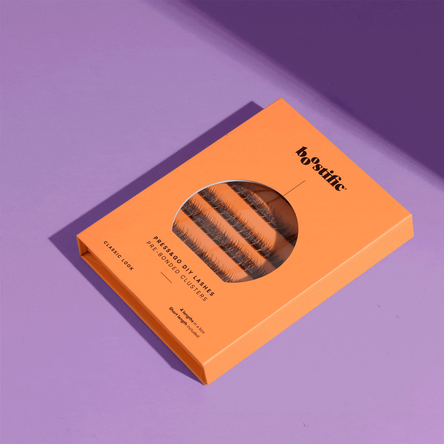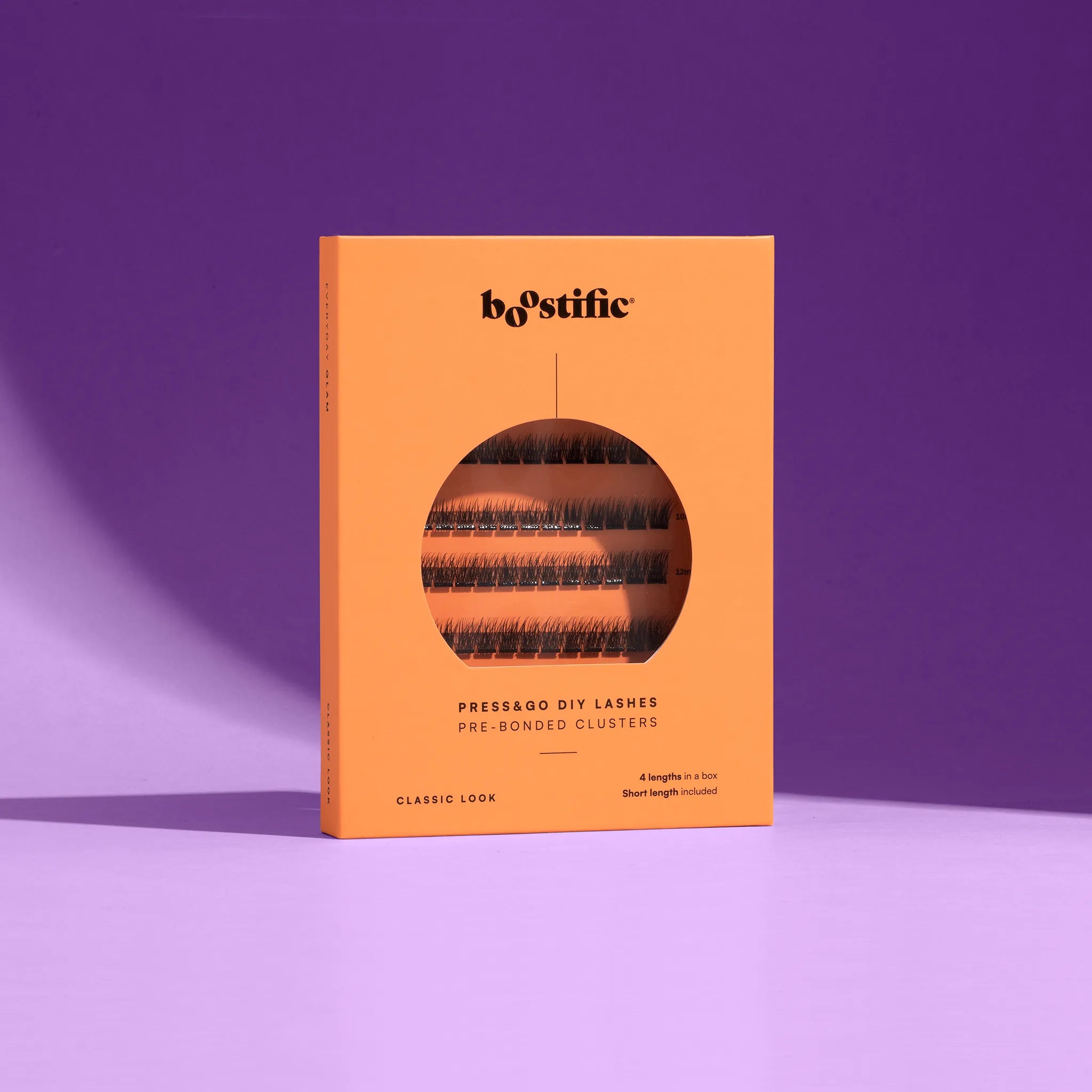 The Boostific Press&Go DIY False Lashes are the perfect combination of professional lash extensions and at-home convenience. Pre-glued clusters ensure a clean, quick, and precise application—no extra adhesive needed. Once applied, they seamlessly blend with your natural lashes while creating a subtle eyeliner effect, thanks to the darker lash roots that softly frame the eyes.